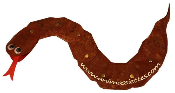 P.S. Une de nos membres nous a envoyé une photo du projet de serpent fait dans sa garderie. J’aime beaucoup cette variante du projet décorée de gommettes pour simuler les écailles du serpent! Merci Janique!